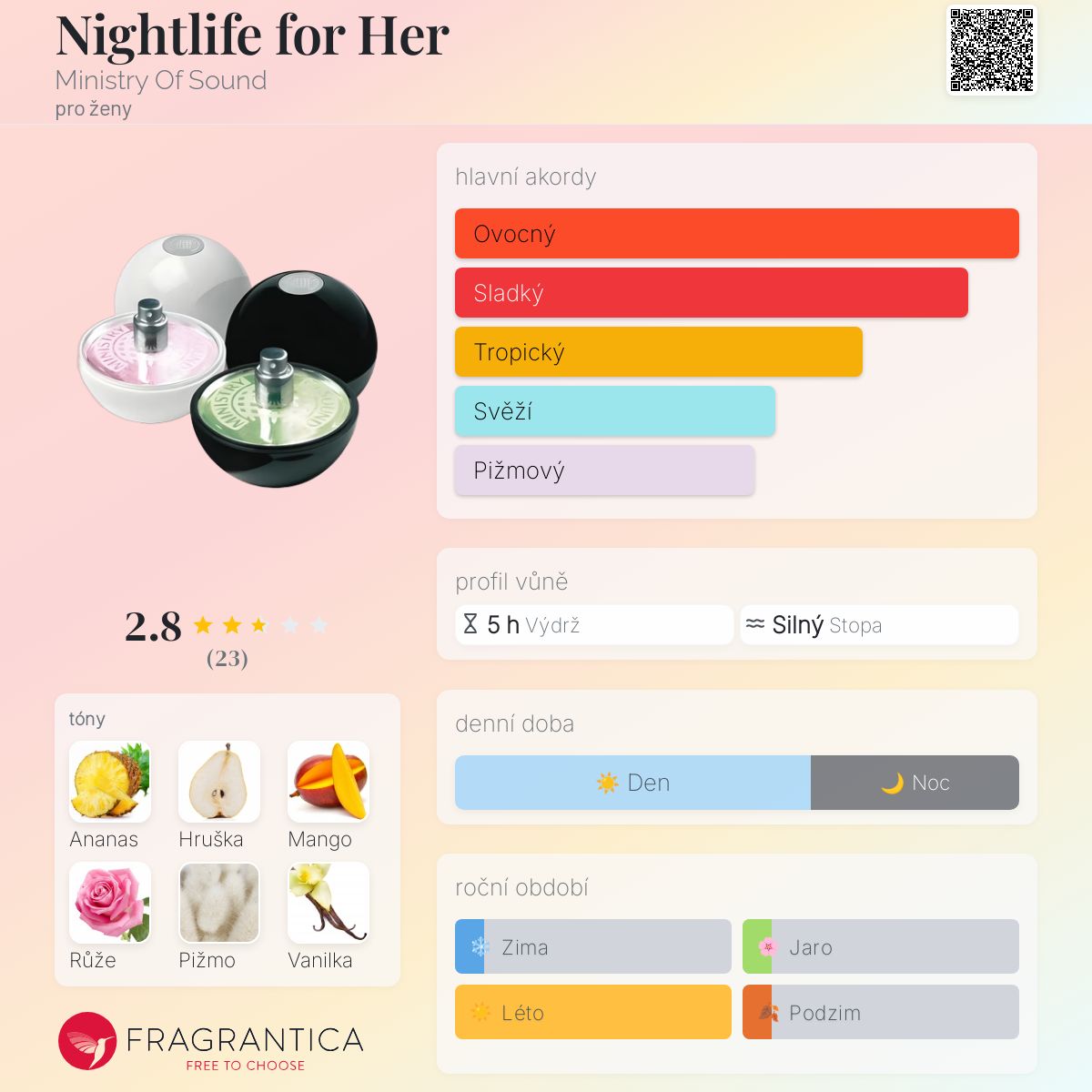 Nightlife for Her podle Ministry Of Sound je Floral Fruity vůně pro ženy. Nightlife for Her byl/a uveden/a v roce 2008. Vrchní tóny jsou Ananas, Růžový pepř a Kasie; střední tóny jsouHruška, Mango a Růže ; základní tóny jsou Pižmo, Vanilka a Pačuli.
