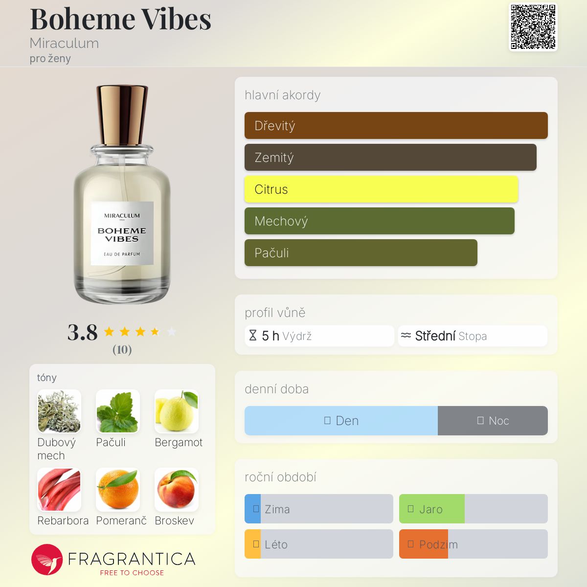 Boheme Vibes podle Miraculum je Chypre vůně pro ženy. Boheme Vibes byl/a uveden/a v roce 2022. Vrchní tóny jsou Bergamot, Rebarbora, Pomeranč a Broskev; střední tóny jsouRůže a Jasmín ; základní tóny jsou Mech, Pačuli, Santalové dřevo a Vetiver.