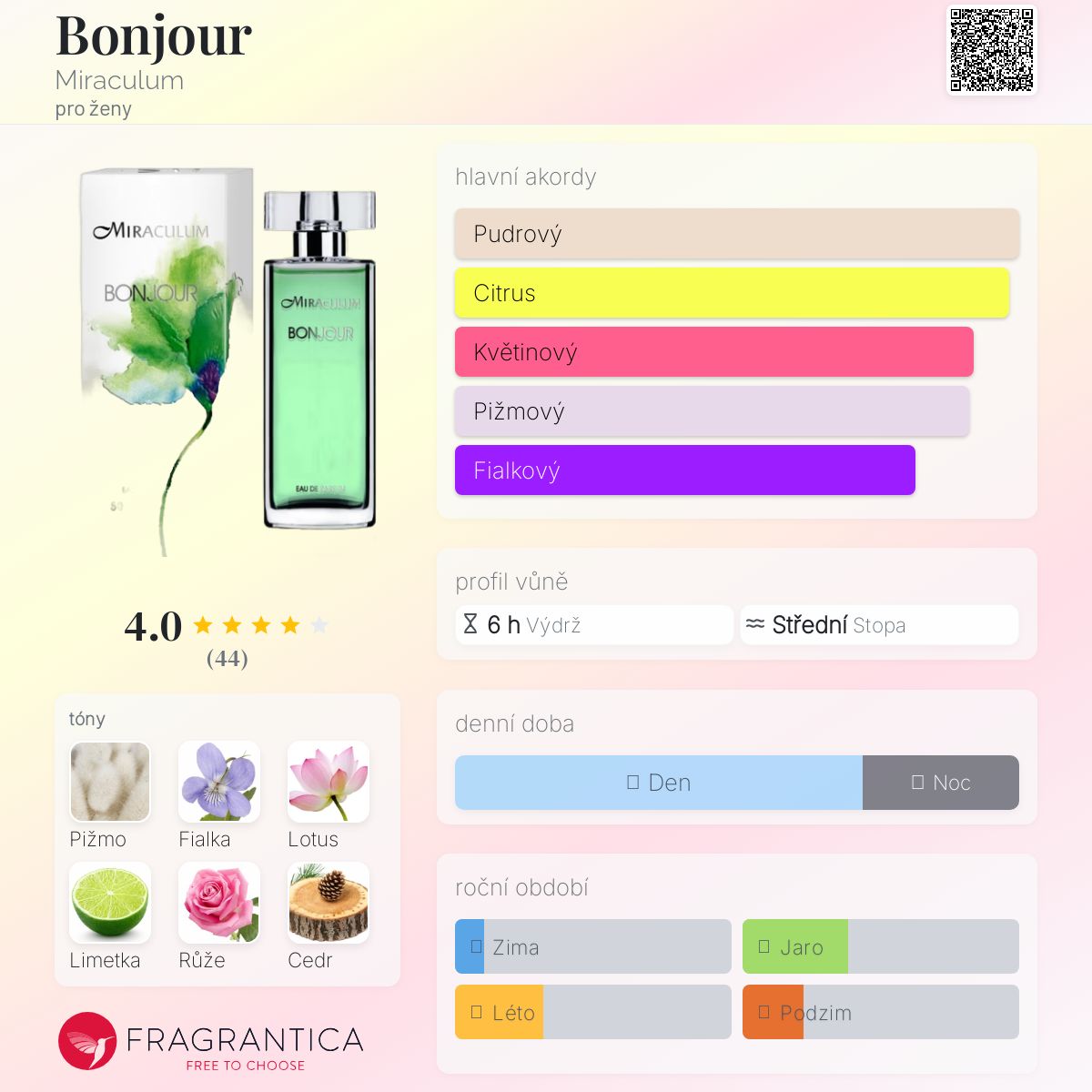 Bonjour podle Miraculum je Floral Fruity vůně pro ženy. Bonjour byl/a uveden/a v roce 2016. Vrchní tóny jsou Limetka a Mandarinka; střední tóny jsouFialka, Lotus a Růže ; základní tóny jsou Pižmo a Cedr.