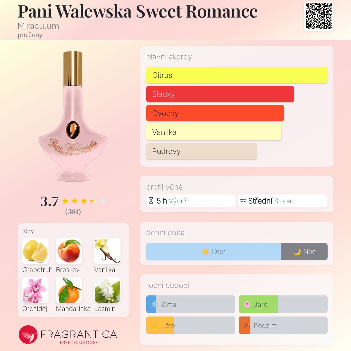 Pani Walewska Sweet Romance podle Miraculum je Floral Fruity vůně pro ženy. Pani Walewska Sweet Romance byl/a uveden/a v roce 2015. Vrchní tóny jsou Grapefruit, Mandarinka, Pomeranč a Hruška; střední tóny jsouBroskev, Orchidej a Jasmín ; základní tóny jsou Vanilka, Fazole tonka, Mandle a Santalové dřevo.
