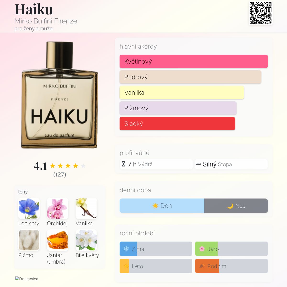 Haiku podle Mirko Buffini Firenze je Floral Woody Musk vůně pro ženy a muže. Haiku byl/a uveden/a v roce 2014. Vrchní tóny jsou Len setý, Bílé květy a Damašská růže; střední tóny jsouOrchidej, Vanilka, Cedr a Červené bobule ; základní tóny jsou Bílé pižmo a Jantar (ambra).