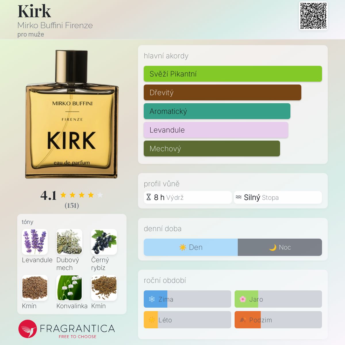 Kirk podle Mirko Buffini Firenze je Woody Spicy vůně pro muže. Kirk byl/a uveden/a v roce 2014. Vrchní tóny jsou Černý rybíz, Římský kmín, Kmín, Pepř a Koriandr; střední tóny jsouLevandule, Konvalinka a Jasmín ; základní tóny jsou Mech, Dřevité tóny, Kůže, Pižmo a Santalové dřevo.