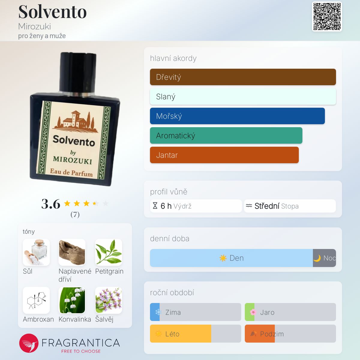 Solvento podle Mirozuki je Aromatic Aquatic vůně pro ženy a muže. Toto je nová vůně. Solvento byl/a uveden/a v roce 2024. Vrchní tóny jsou Mořská sůl, Citronový list a Jalovec; střední tóny jsouKonvalinka, Šalvěj a Bílý čaj ; základní tóny jsou Naplavené dříví, Ambroxan a Kosatec.