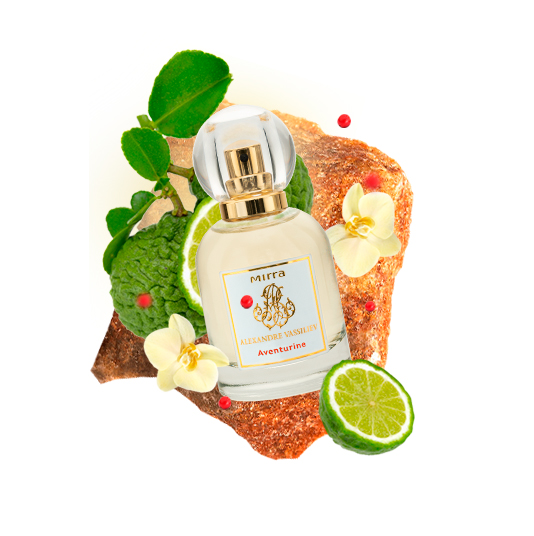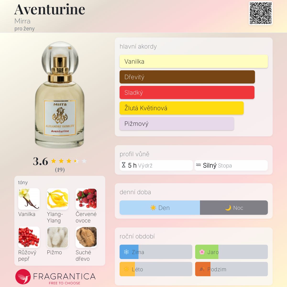 Aventurine podle Mirra je Floral Woody Musk vůně pro ženy. Aventurine byl/a uveden/a v roce 2020. "Nosem" za touto vůní je Sébastien Martin. Vrchní tóny jsou Růžový pepř a Bergamot; střední tóny jsouYlang-Ylang, Červené ovoce, Cedr a Ambrette (přírodní pižmo) ; základní tóny jsou Vanilka, Pižmo a Suché dřevo.