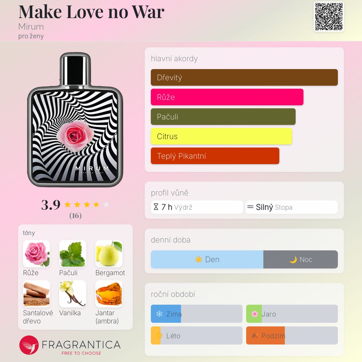 Make Love no War podle Mirum je Orientální Floral vůně pro ženy. Make Love no War byl/a uveden/a v roce 2015. Vrchní tóny jsou Růže, Bergamot a Kosatec; střední tóny jsouRůže, Santalové dřevo a Vanilka ; základní tóny jsou Pačuli, Jantar (ambra) a Cedr.