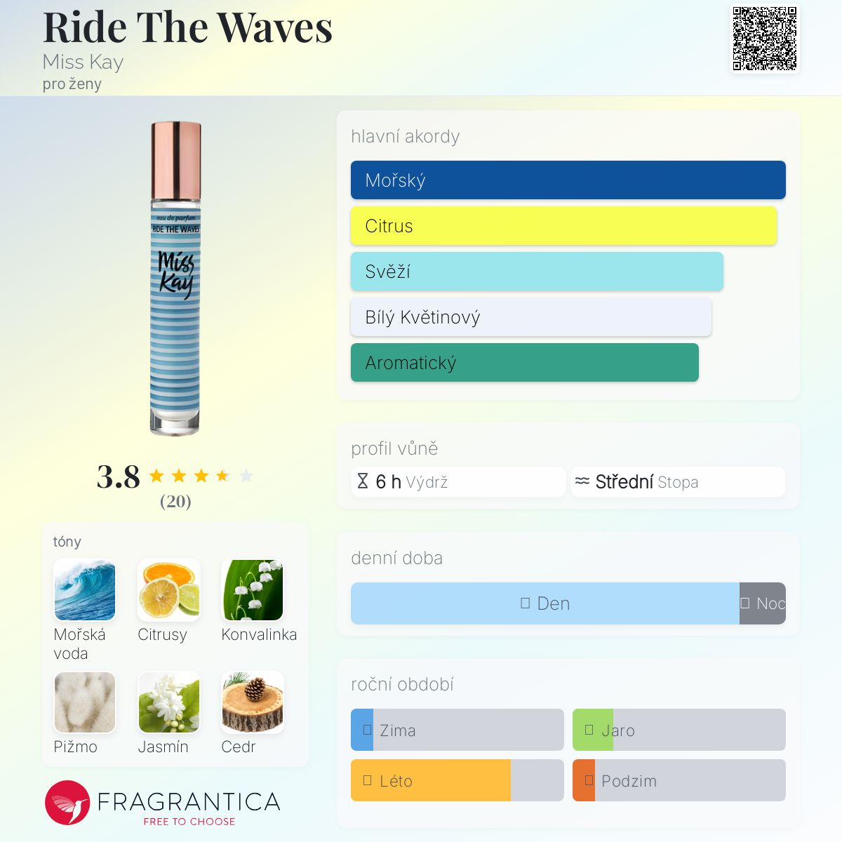 Ride The Waves podle Miss Kay je Floral Aquatic vůně pro ženy. Vrchní tóny jsou Mořské tóny a Citrusy; střední tóny jsouKonvalinka a Vodní jasmín ; základní tóny jsou Pižmo a Cedr.