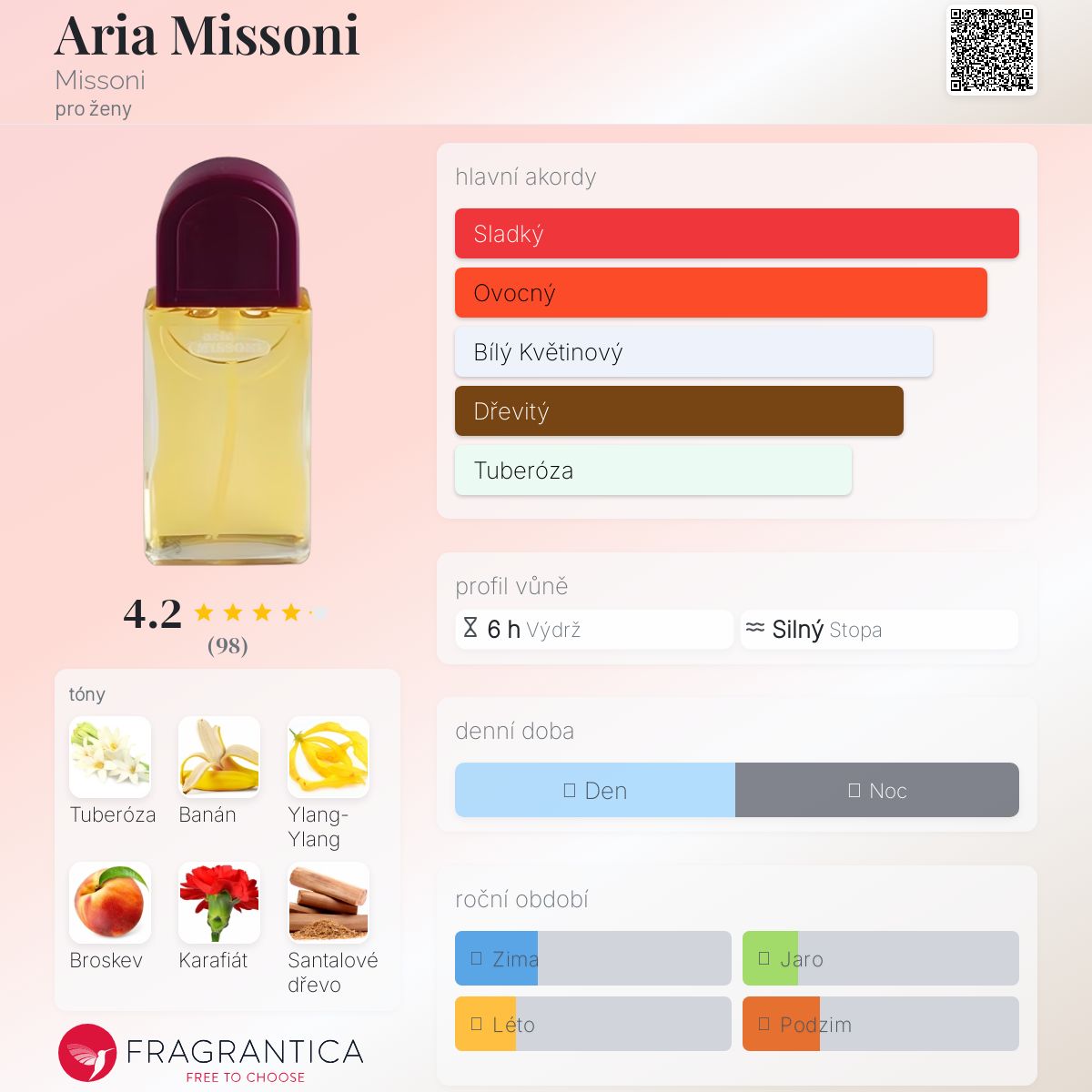 Aria Missoni podle Missoni je Floral Fruity vůně pro ženy. Aria Missoni byl/a uveden/a v roce 1987. Vrchní tóny jsou Banán, Broskev, Maliny, Ananas, Bergamot a Citrón; střední tóny jsouTuberóza, Ylang-Ylang, Karafiát, Jasmín, Konvalinka a Růže ; základní tóny jsou Santalové dřevo, Jantar (ambra), Fazole tonka, Pižmo, Vanilka a Cedr.