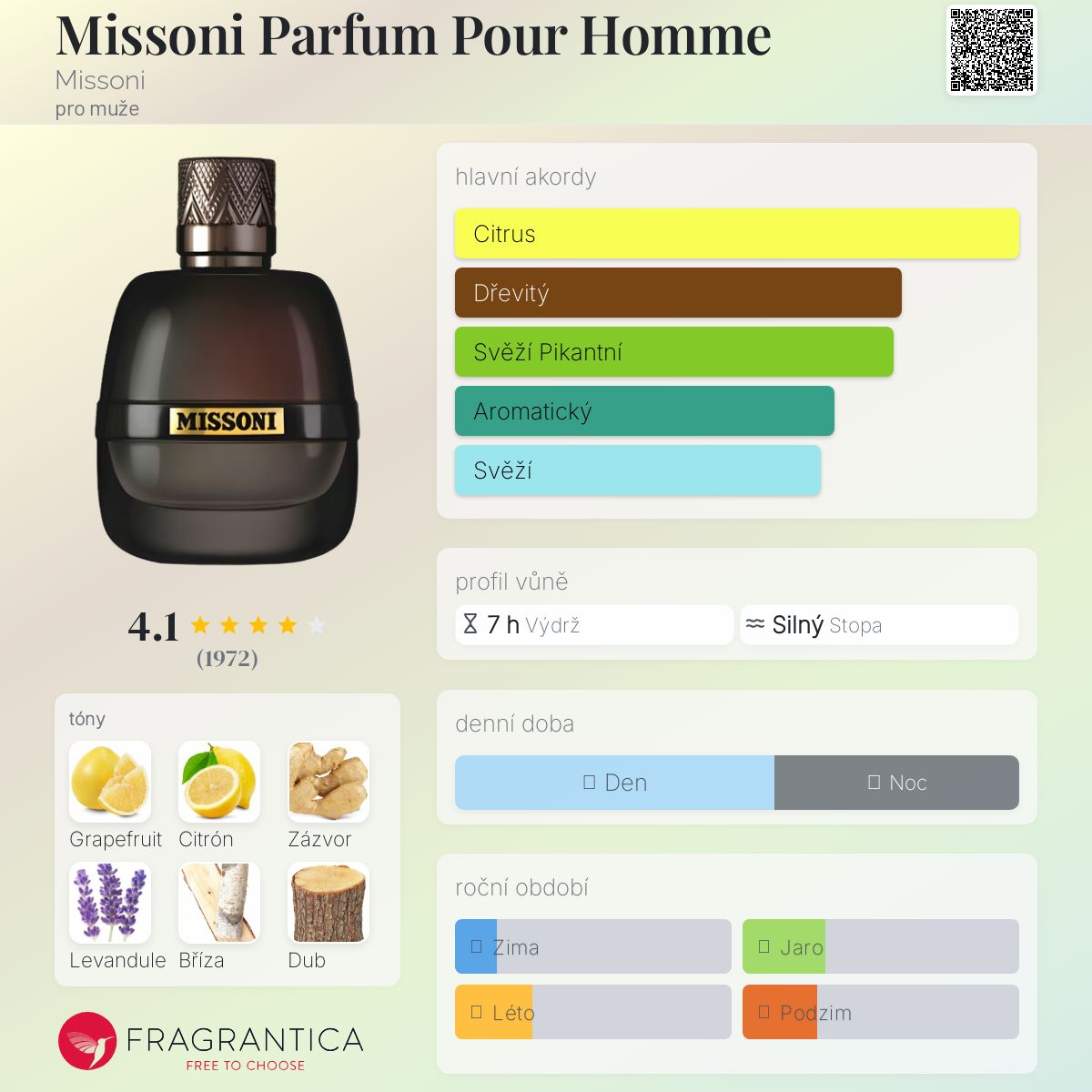 Missoni Parfum Pour Homme podle Missoni je Woody Aromatic vůně pro muže. Missoni Parfum Pour Homme byl/a uveden/a v roce 2017. Vrchní tóny jsou Grapefruit, Citrón a Levandule; střední tóny jsouZázvor, Jablko a Jasmín ; základní tóny jsou Bříza, Dub, Pižmo, Santalové dřevo a Pačuli.