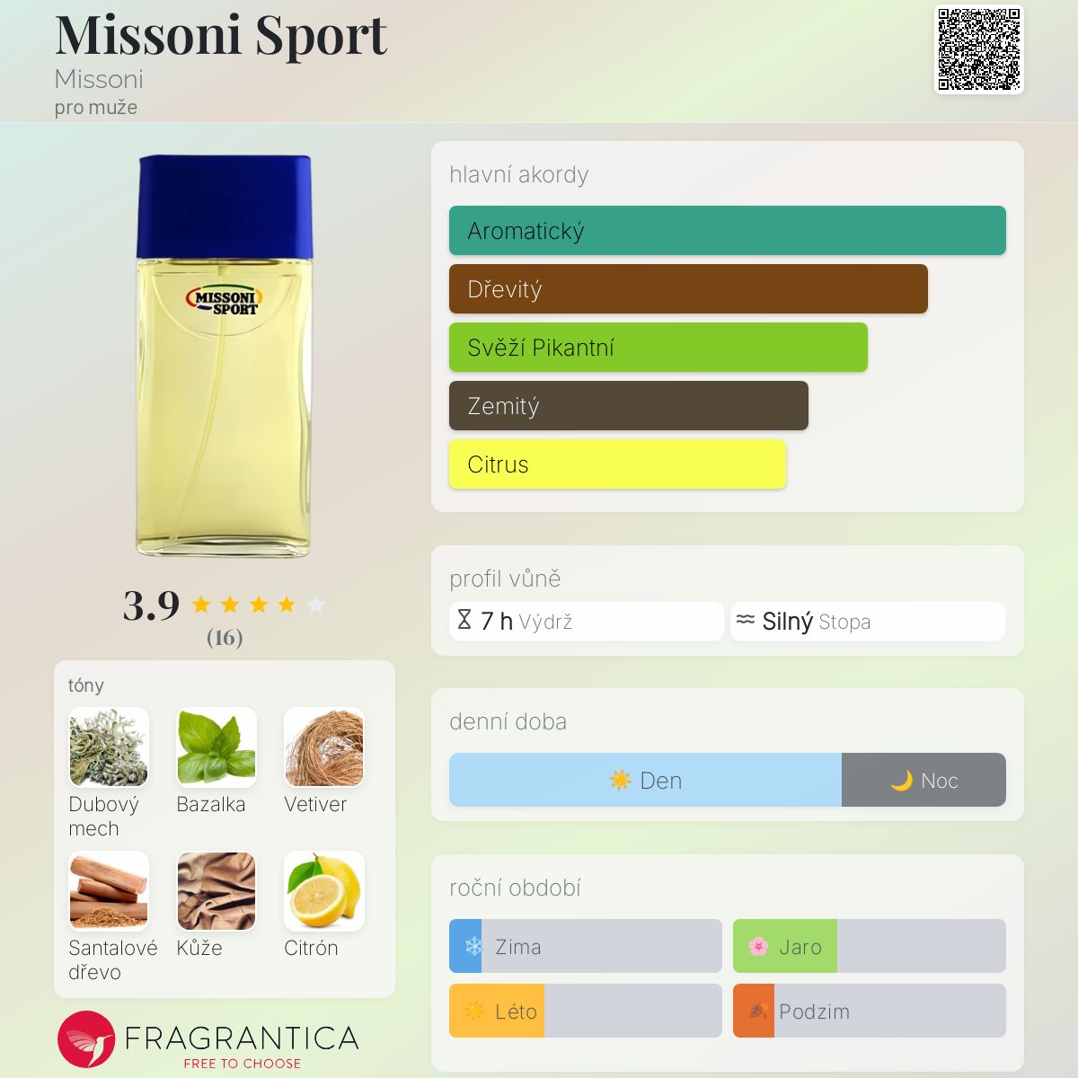 Missoni Sport podle Missoni je Aromatic Fougere vůně pro muže. Missoni Sport byl/a uveden/a v roce 1990. Vrchní tóny jsou Citron amalfi , Borovice, Bergamot, Galbanum a Mandarinka; střední tóny jsouBazalka, Pelargónie, Citronová verbena, Estragon, Tymián, Rozmarýn, Levandule, Jasmín, Skořice, Jalovcové bobulky a Brambořík ; základní tóny jsou Dubový mech, Vetiver, Santalové dřevo, Kůže, Pižmo, Virginský cedr a Pačuli.