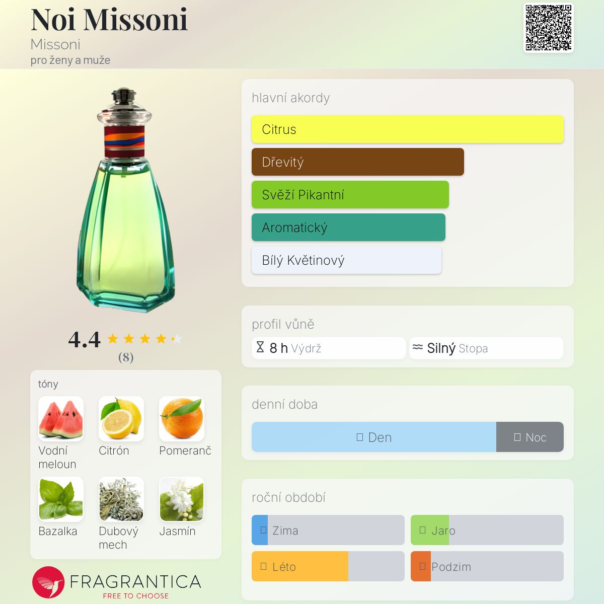 Noi Missoni podle Missoni je Chypre Floral vůně pro ženy a muže. Noi Missoni byl/a uveden/a v roce 1993. Vrchní tóny jsou Citron amalfi , Pomeranč, Neroli, Grapefruit a Mandarinka; střední tóny jsouVodní meloun, Bazalka, Jasmín, Citronová verbena, Broskev, Hřebíček, Červené jablko, Růže a Konvalinka ; základní tóny jsou Dubový mech, Santalové dřevo, Pačuli, Virginský cedr a Pižmo.
