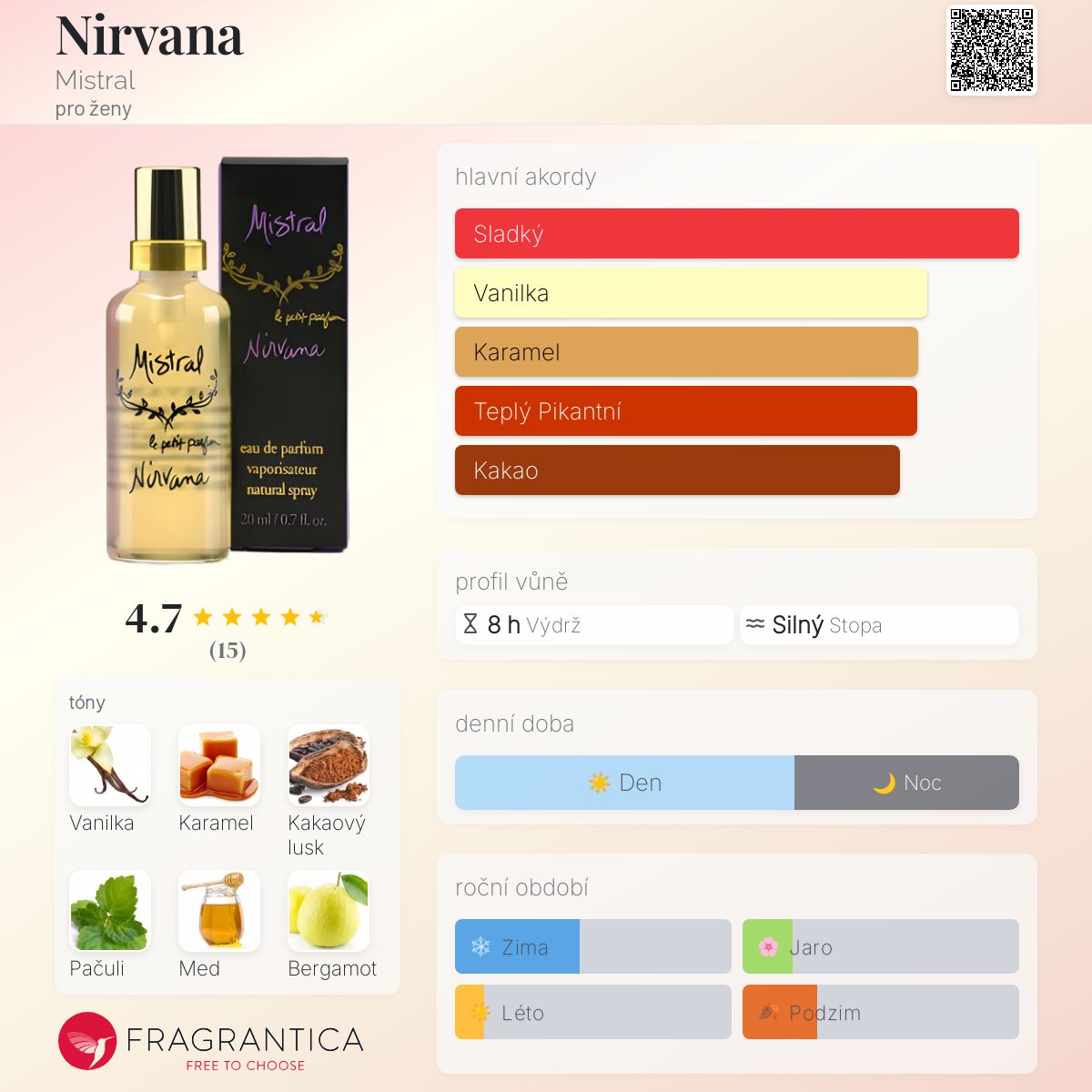 Nirvana podle Mistral je Orientální Vanilla vůně pro ženy. Nirvana byl/a uveden/a v roce 2010. Vrchní tón je Bergamot ; střední tóny jsouKaramel, Bílý med a Červené bobule ; základní tóny jsou Vanilka, Kakao a Pačuli.