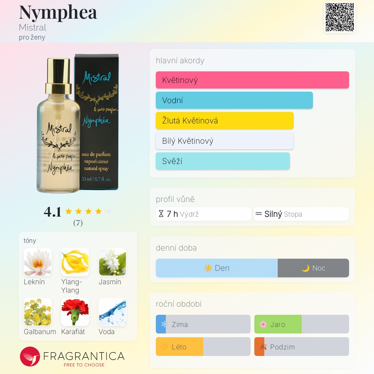 Nymphea podle Mistral je Floral Aquatic vůně pro ženy. Nymphea byl/a uveden/a v roce 2010. Vrchní tóny jsou Ylang-Ylang, Galbanum a Černý rybíz; střední tóny jsouLeknín, Jasmín, Karafiát a Vodní tóny ; základní tóny jsou Pižmo a Vanilka.
