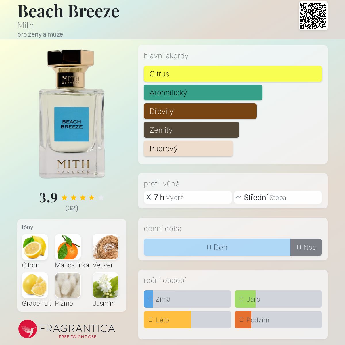 Beach Breeze podle Mith je Aromatic Aquatic vůně pro ženy a muže. Beach Breeze byl/a uveden/a v roce 2021. "Nosem" za touto vůní je Jutinat Piyaweerawong. Vrchní tóny jsou Citrón, Mandarinka a Grapefruit; střední tóny jsouJasmín, Kosatec a Pelargónie ; základní tóny jsou Vetiver, Pižmo, Santalové dřevo, Benzoin, Cedr a Dubový mech.