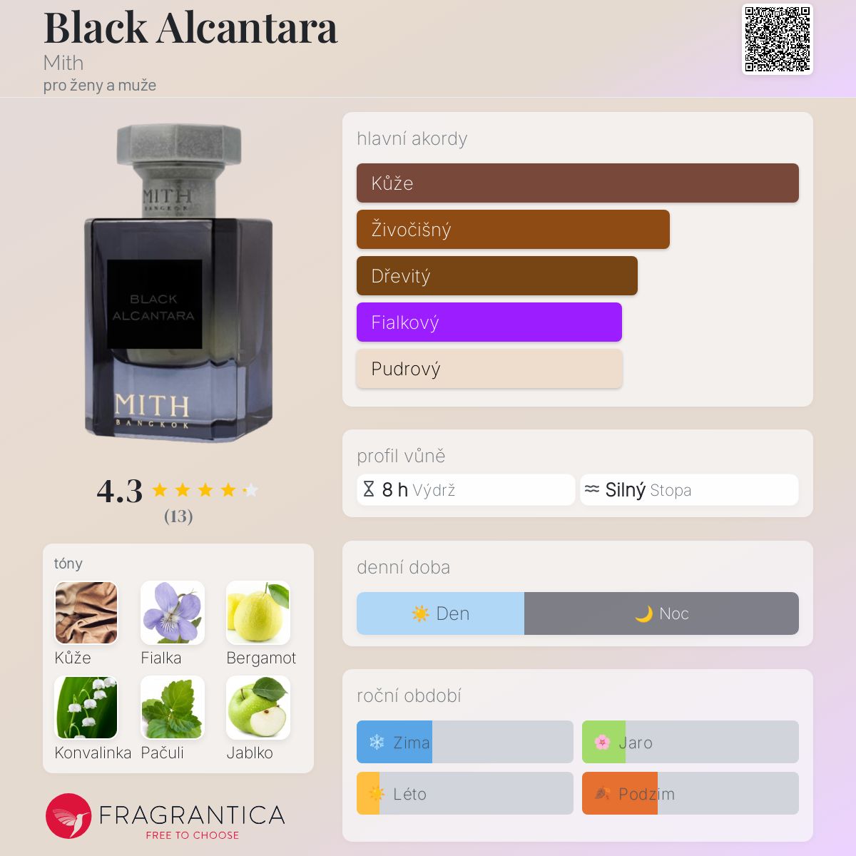 Black Alcantara podle Mith je Orientální Fougere vůně pro ženy a muže. Toto je nová vůně. Black Alcantara byl/a uveden/a v roce 2025. "Nosem" za touto vůní je Hamid Merati-Kashani. Vrchní tóny jsou Bergamot, Jablko a Pepř; střední tóny jsouKonvalinka, Fialka a Růže ; základní tóny jsou Kůže, Cedr, Benzoin, Pačuli a Pižmo.