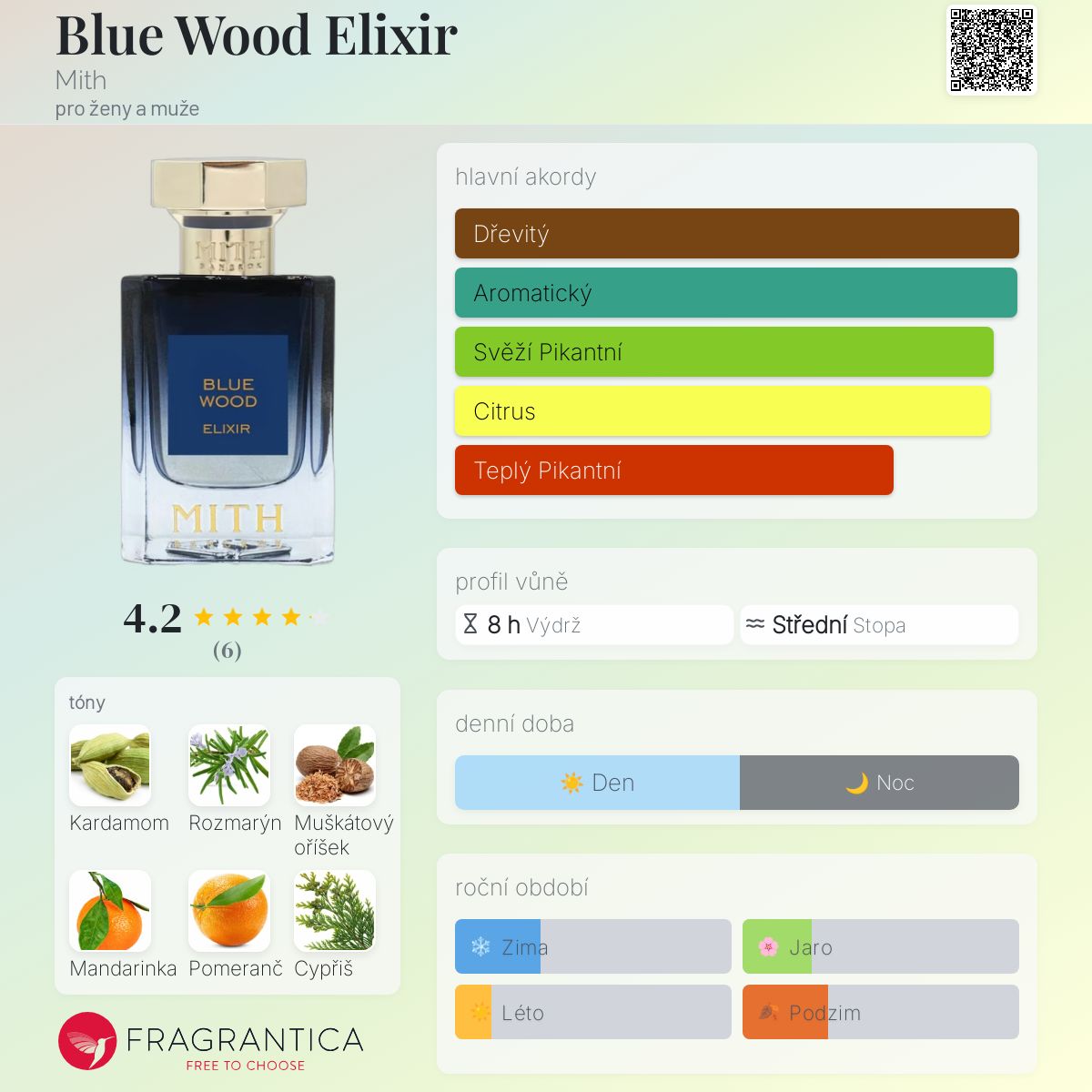 Blue Wood Elixir podle Mith je Orientální Woody vůně pro ženy a muže. Toto je nová vůně. Blue Wood Elixir byl/a uveden/a v roce 2025. "Nosem" za touto vůní je Hamid Merati-Kashani. Vrchní tóny jsou Kardamom, Mandarinka, Pomeranč a Citrón; střední tóny jsouRozmarýn, Muškátový oříšek, Cypřiš a Květinové tóny ; základní tóny jsou Cedr, Pačuli, Labdanum a Pižmo.