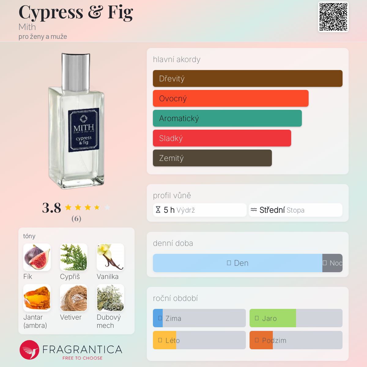 Cypress & Fig podle Mith je vůně pro ženy a muže. Vrchní tóny jsou Zázvor, Máta a Koriandr; střední tóny jsouFík, Cypřiš a Fíkový list ; základní tóny jsou Vanilka, Jantar (ambra), Vetiver, Dubový mech, Cedr a Pižmo.