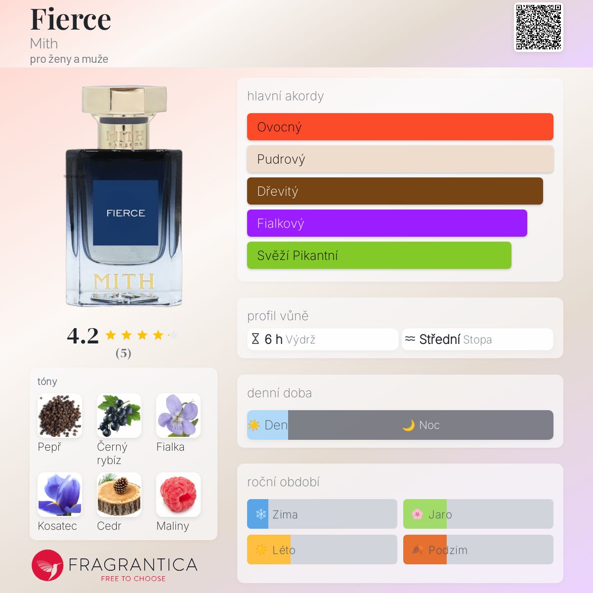 Fierce podle Mith je Leather vůně pro ženy a muže. Toto je nová vůně. Fierce byl/a uveden/a v roce 2025. "Nosem" za touto vůní je Shyamala Maisondieu. Vrchní tóny jsou Pepř, Černý rybíz, Maliny a Šafrán; střední tóny jsouFialka, Kosatec a Růže ; základní tóny jsou Cedr, Pižmo a Kůže.