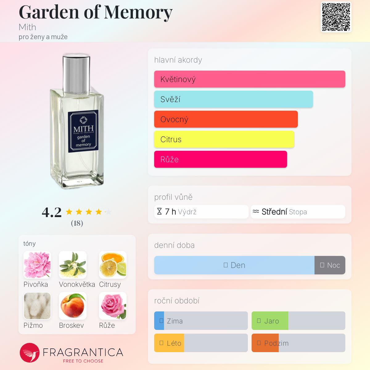 Garden of Memory podle Mith je vůně pro ženy a muže. Vrchní tóny jsou Pivoňka, Citrusy, Broskev, Mandarinka, Růžový pepř, Meloun a Jablko; střední tóny jsouVonokvětka, Růže a Jasmín ; základní tóny jsou Pižmo, Ambra, Santalové dřevo a Pačuli.