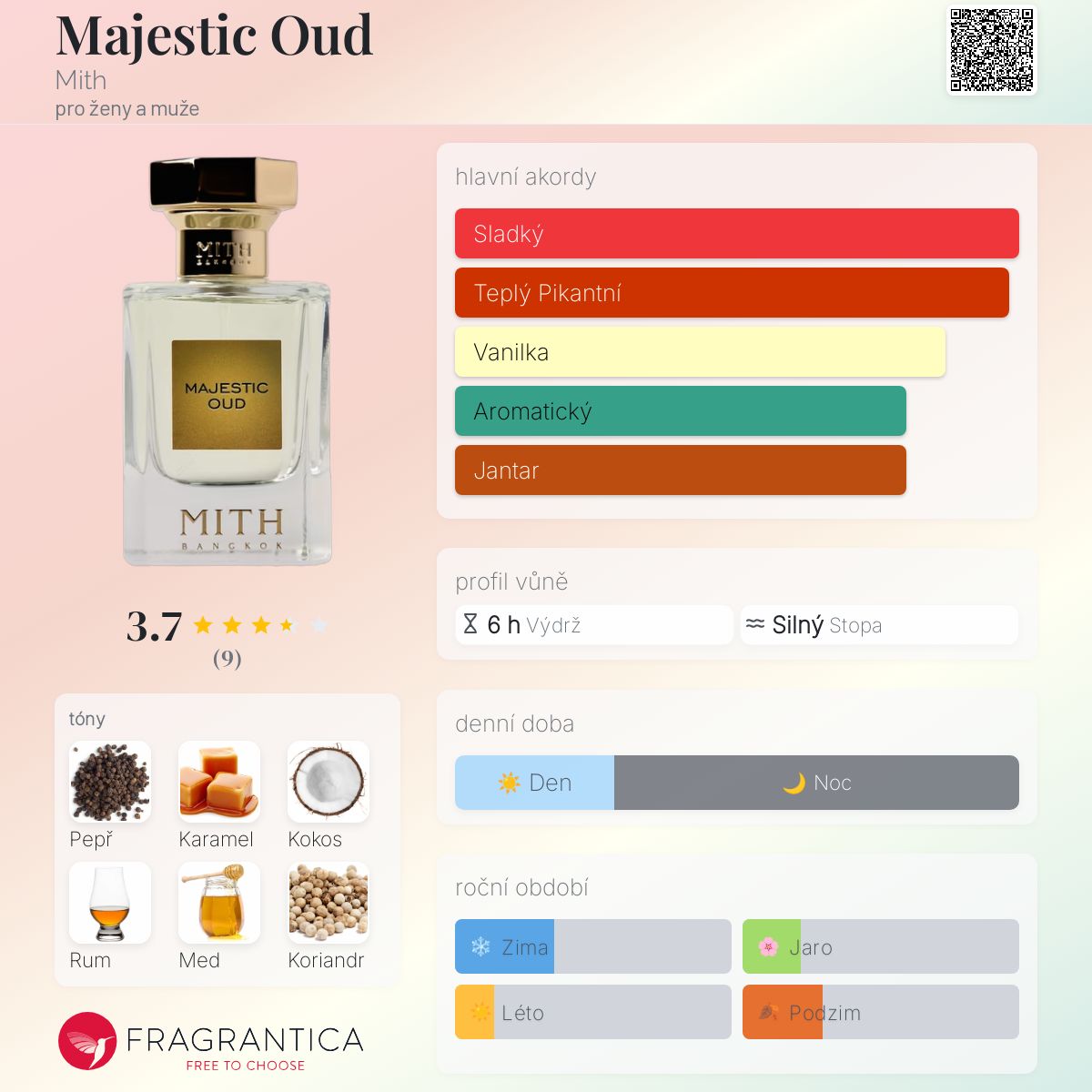 Majestic Oud podle Mith je Orientální Vanilla vůně pro ženy a muže. Majestic Oud byl/a uveden/a v roce 2022. Vrchní tóny jsou Černý pepř, Karamel, Kokos, Rum a Med; střední tóny jsouKoriandr, Jasmín, Pelargónie, Otočník, Růže a Orchidej ; základní tóny jsou Kůže, Pačuli, Vanilka, Kadidlo, Santalové dřevo, Fazole tonka, Kakao, Tabák a Myrha.