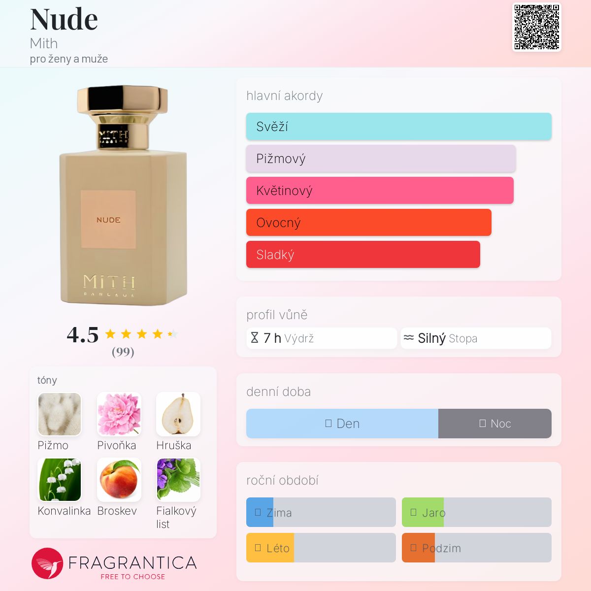 Nude podle Mith je Floral Woody Musk vůně pro ženy a muže. Toto je nová vůně. Nude byl/a uveden/a v roce 2025. "Nosem" za touto vůní je Quentin Bisch. Vrchní tóny jsou Hruška, Broskev a Bergamot; střední tóny jsouPivoňka, Konvalinka a Fialkové listy ; základní tóny jsou Pižmo, Fazole tonka, Mech a Vetiver.