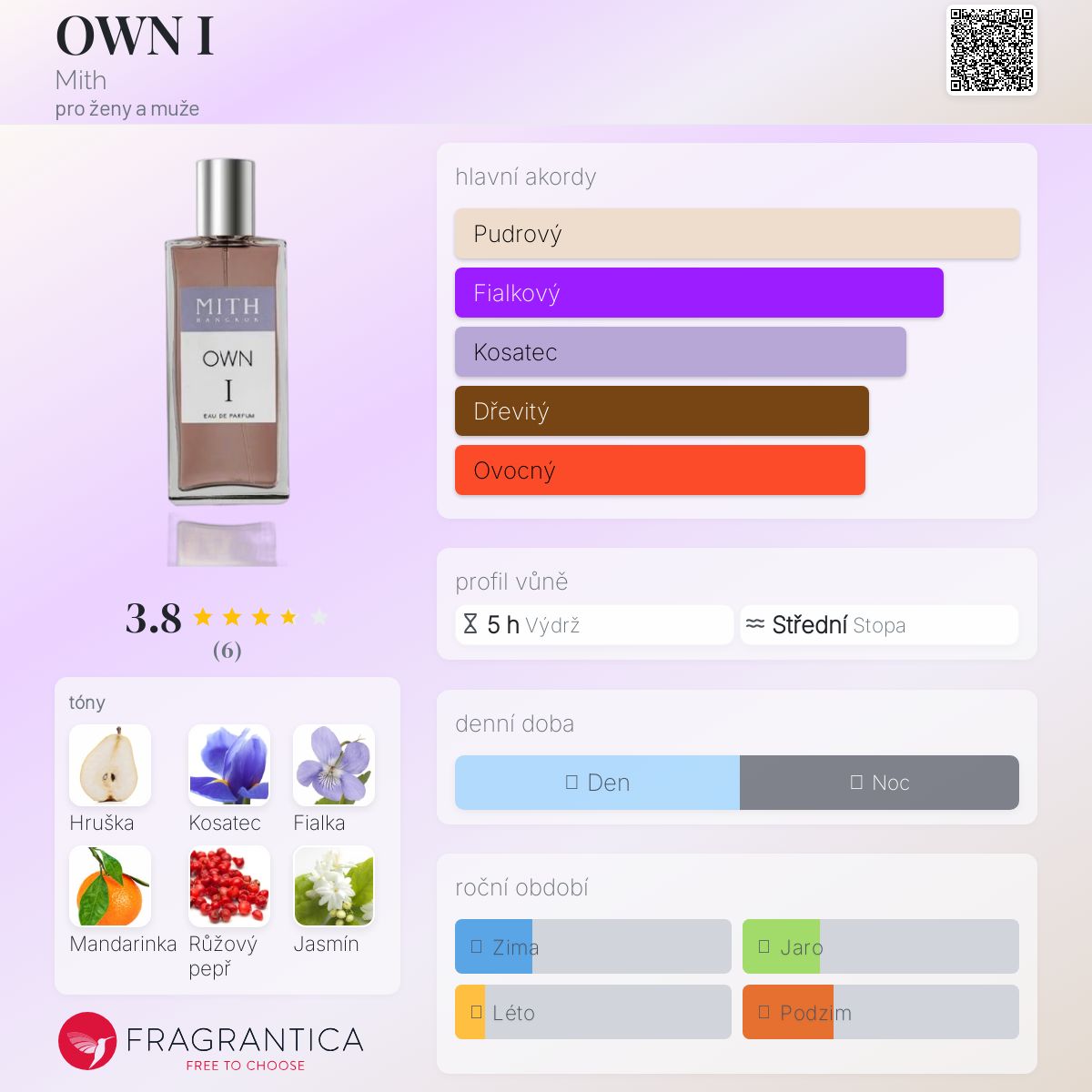 OWN I podle Mith je vůně pro ženy a muže. OWN I byl/a uveden/a v roce 2020. Vrchní tóny jsou Hruška, Mandarinka a Růžový pepř; střední tóny jsouKosatec, Fialka a Jasmín ; základní tóny jsou Pačuli, Vanilka, Pižmo a Santalové dřevo.