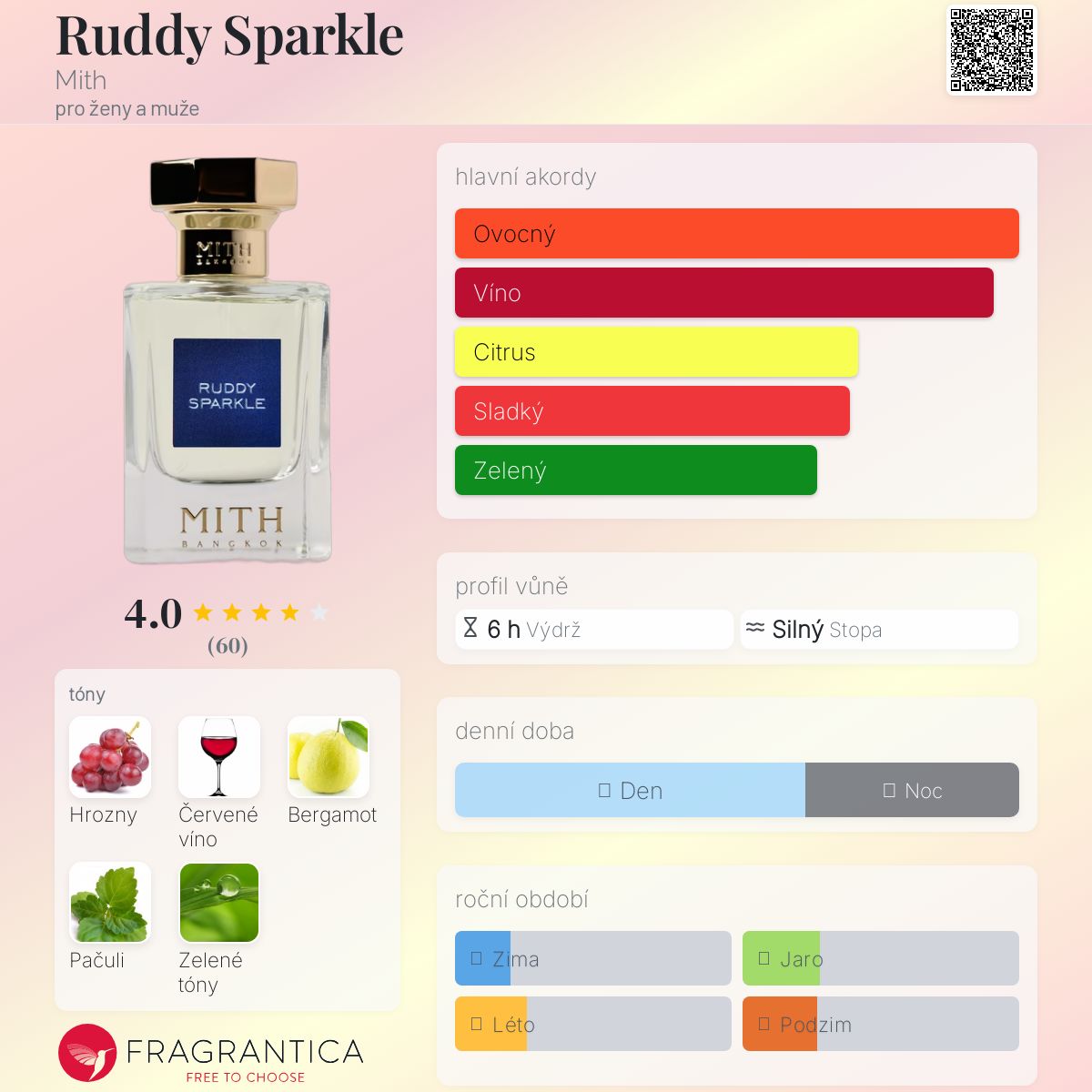 Ruddy Sparkle podle Mith je vůně pro ženy a muže. Vrchní tóny jsou Červené víno a Bergamot; střední tón jeHrozny ; základní tóny jsou Pačuli a Zelené listí.