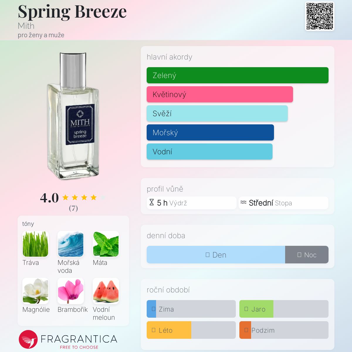 Spring Breeze podle Mith je vůně pro ženy a muže. Vrchní tóny jsou Tráva, Pikantní máta, Vodní meloun a Rozmarýn; střední tóny jsouMořské tóny, Magnólie, Brambořík a Kokos ; základní tóny jsou Bílé dřevo, Pižmo, Jantar (ambra) a Dubový mech.