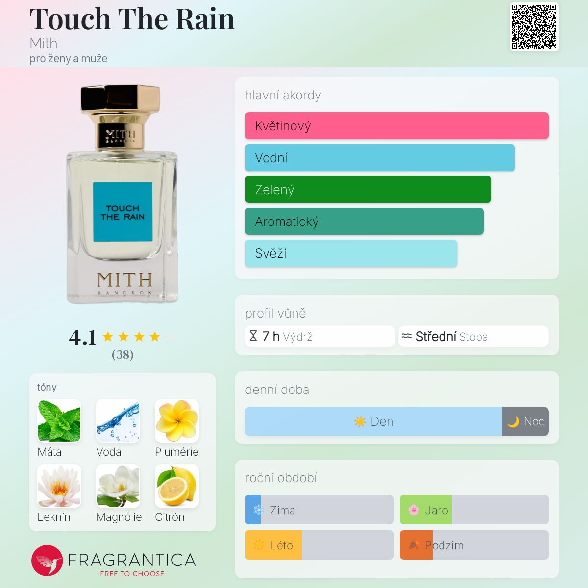 Touch The Rain podle Mith je Aromatic Aquatic vůně pro ženy a muže. Vrchní tóny jsou Pikantní máta, Vodní tóny, Leknín a Citrón; střední tóny jsouPlumérie, Magnólie a Jasmín ; základní tóny jsou Vetiver a Kardamom.
