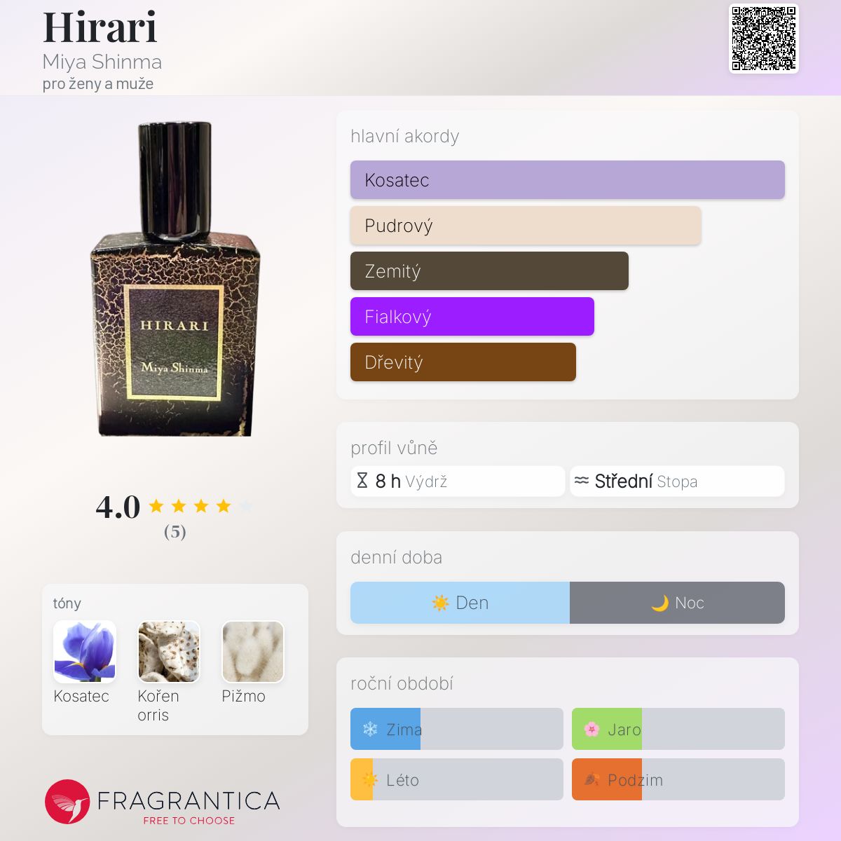 Hirari podle Miya Shinma je vůně pro ženy a muže. Toto je nová vůně. Hirari byl/a uveden/a v roce 2025. "Nosem" za touto vůní je Miya Shinma.