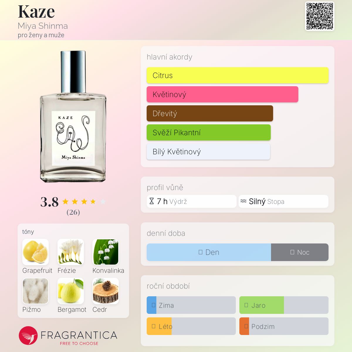 Kaze podle Miya Shinma je Floral Woody Musk vůně pro ženy a muže. "Nosem" za touto vůní je Miya Shinma. Vrchní tóny jsou Grapefruit a Bergamot; střední tóny jsouFrézie a Konvalinka ; základní tóny jsou Pižmo, Cedr a Dřevo cypřišku tupolistého.