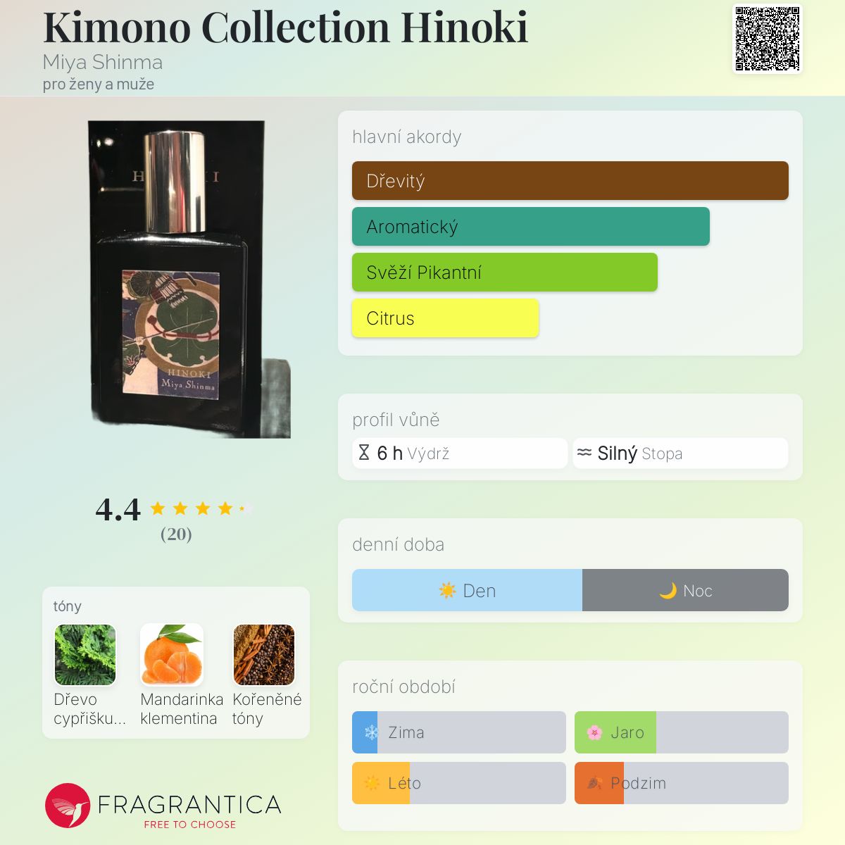 Kimono Collection Hinoki podle Miya Shinma je Woody Aromatic vůně pro ženy a muže. Kimono Collection Hinoki byl/a uveden/a v roce 2017. "Nosem" za touto vůní je Miya Shinma.