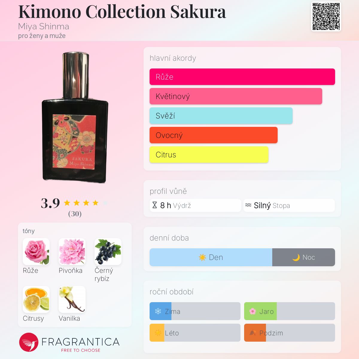 Kimono Collection Sakura podle Miya Shinma je Floral vůně pro ženy a muže. Kimono Collection Sakura byl/a uveden/a v roce 2017. "Nosem" za touto vůní je Miya Shinma. Vrchní tóny jsou Růže a Citrusy; střední tóny jsouRůže, Pivoňka a Černý rybíz ; základní tón je Vanilka.
