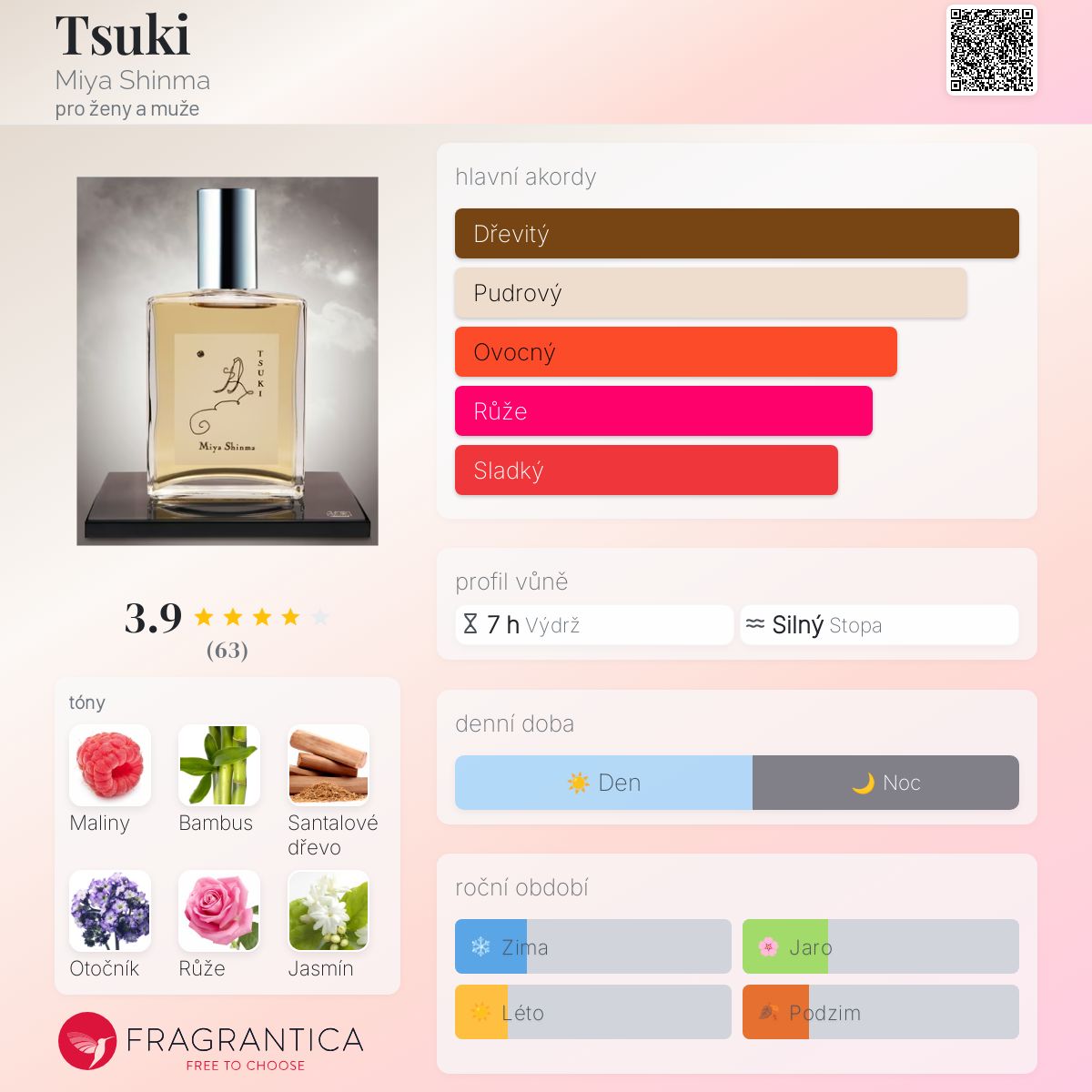 Tsuki podle Miya Shinma je Orientální Floral vůně pro ženy a muže. "Nosem" za touto vůní je Miya Shinma. Vrchní tóny jsou Maliny a Bambus; střední tóny jsouRůže a Jasmín ; základní tóny jsou Santalové dřevo, Otočník a Pižmo.