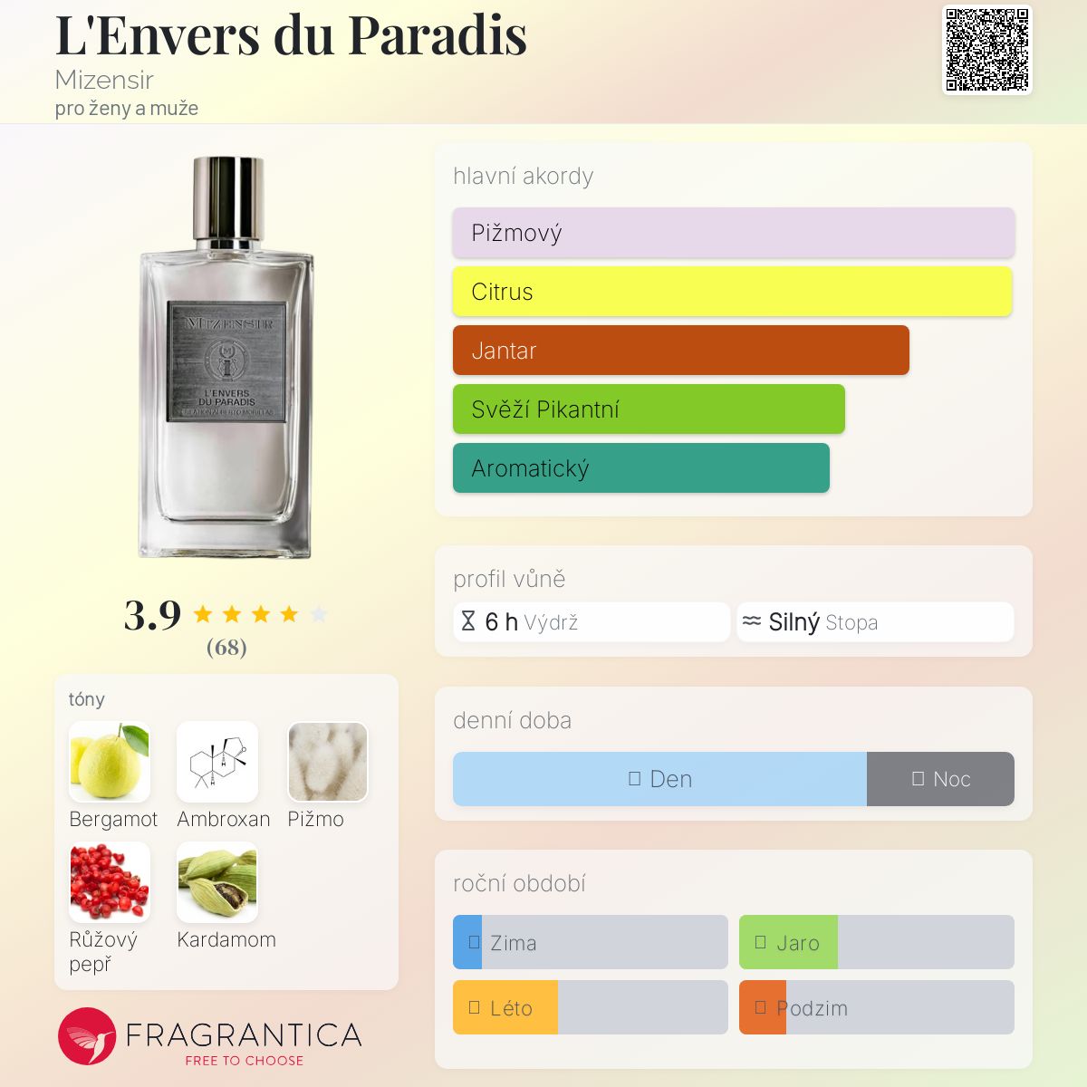 L'Envers du Paradis podle Mizensir je vůně pro ženy a muže. L'Envers du Paradis byl/a uveden/a v roce 2015. "Nosem" za touto vůní je Alberto Morillas. Vrchní tóny jsou Kalábrijský bergamot a Růžový pepř; střední tón jeGuatemalský kardamom ; základní tóny jsou Ambroxan a Pižmo.