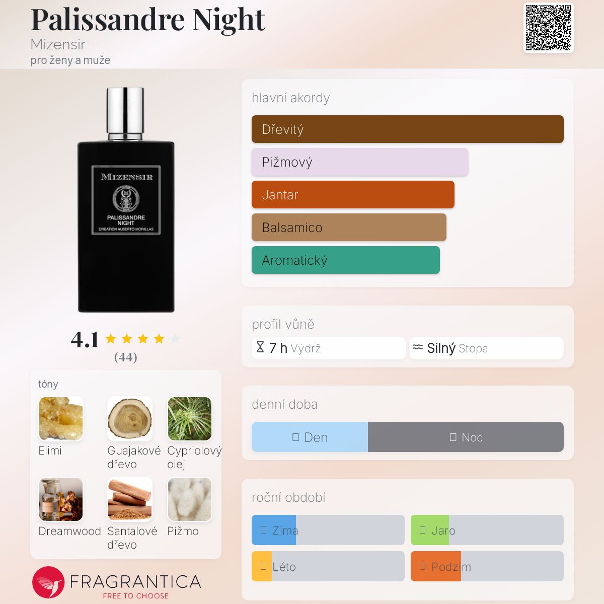 Palissandre Night podle Mizensir je Orientální Woody vůně pro ženy a muže. Palissandre Night byl/a uveden/a v roce 2023. "Nosem" za touto vůní je Alberto Morillas. Vrchní tóny jsou Ambroxan, Cetalox a Muškátový oříšek; střední tóny jsouElimi, Guajakové dřevo, Cypriolový olej a Labdanum ; základní tóny jsou Dreamwood, Santalové dřevo, Pižmo a Pačuli.