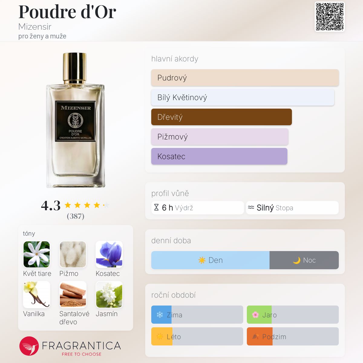 Poudre d'Or podle Mizensir je Orientální Floral vůně pro ženy a muže. Poudre d'Or byl/a uveden/a v roce 2018. "Nosem" za touto vůní je Alberto Morillas. Vrchní tóny jsou Květ tiare a Jasmín; střední tóny jsouKosatec a Pižmo ; základní tóny jsou Madagaskarská vanilka a Santalové dřevo.