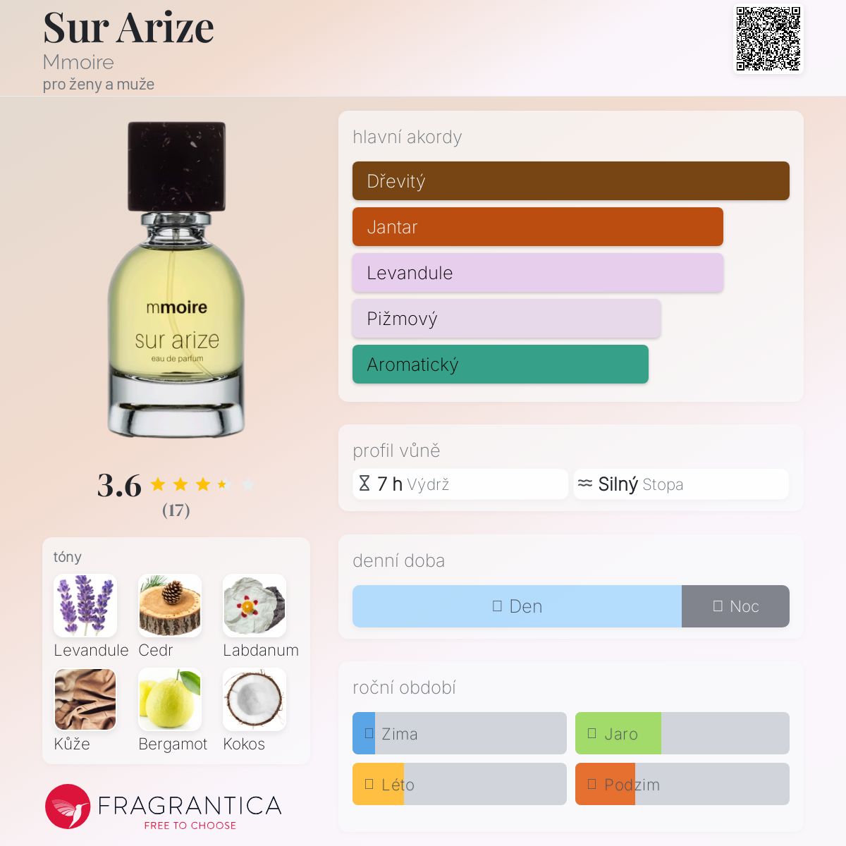 Sur Arize podle Mmoire je Woody Floral Musk vůně pro ženy a muže. Sur Arize byl/a uveden/a v roce 2022. "Nosem" za touto vůní je Sophie van Balen. Vrchní tóny jsou Bergamot a Kokos; střední tóny jsouLevandule, Cedr a Labdanum ; základní tóny jsou Pižmo, Kůže, Ambroxan a Dubový mech.