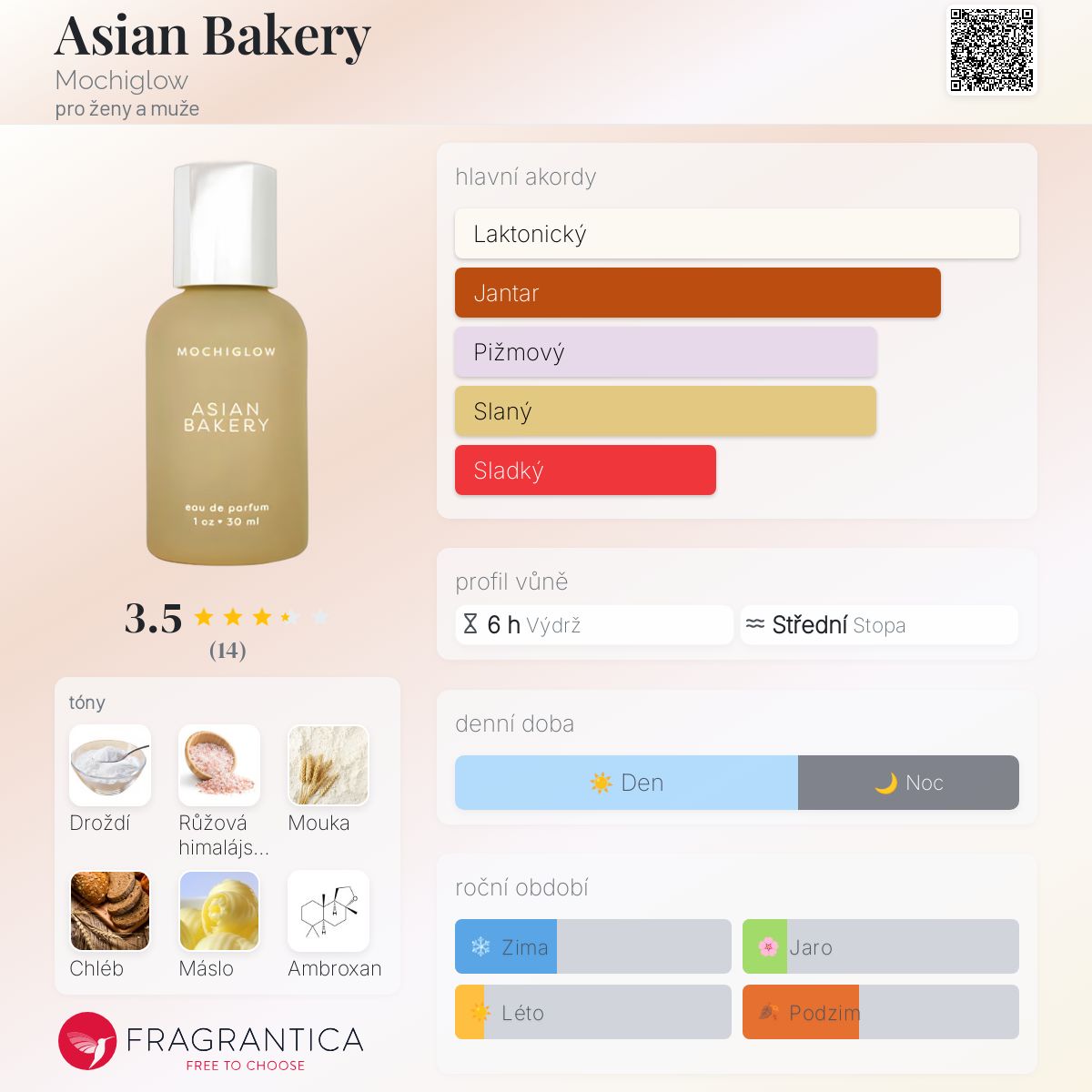 Asian Bakery podle Mochiglow je vůně pro ženy a muže. Asian Bakery byl/a uveden/a v roce 2023. "Nosem" za touto vůní je Jenny Chang. Vrchní tóny jsou Růžová himalájská mořská sůl a Máslo; střední tóny jsouMouka, Čerstvá smetana a Mléko ; základní tóny jsou Droždí, Chléb a Ambroxan.