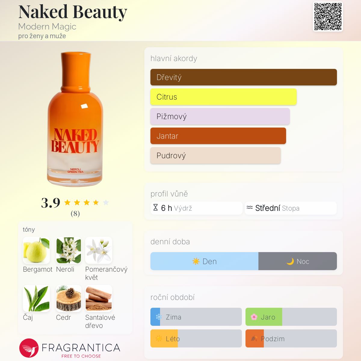 Naked Beauty podle Modern Magic je Citrus vůně pro ženy a muže. Toto je nová vůně. Naked Beauty byl/a uveden/a v roce 2024. Vrchní tóny jsou Bergamot a Neroli; střední tóny jsouPomerančový květ, Zelený čaj a Cedr ; základní tóny jsou Santalové dřevo, Iso E Super, Jantar (ambra) a Pižmo.