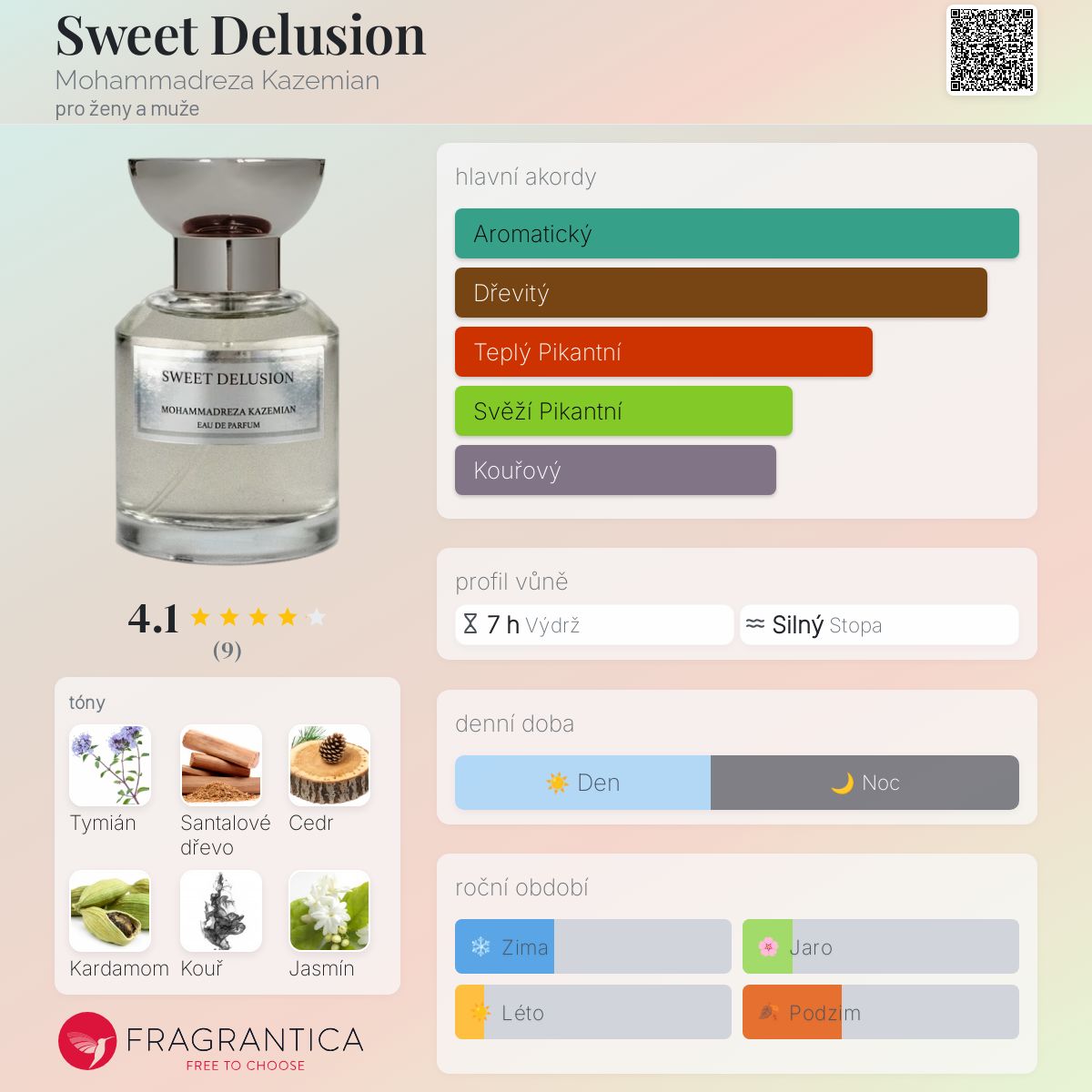 Sweet Delusion podle Mohammadreza Kazemian je Woody Spicy vůně pro ženy a muže. Sweet Delusion byl/a uveden/a v roce 2020. "Nosem" za touto vůní je Mohammadreza Kazemian.