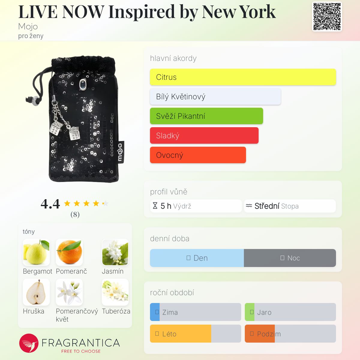 LIVE NOW Inspired by New York podle Mojo je Floral vůně pro ženy. LIVE NOW Inspired by New York byl/a uveden/a v roce 2010. Vrchní tóny jsou Bergamot, Pomeranč a Hruška; střední tóny jsouJasmín, Květ afrického pomeranče a Tuberóza ; základní tóny jsou Pižmo, Vanilka a Broskev.