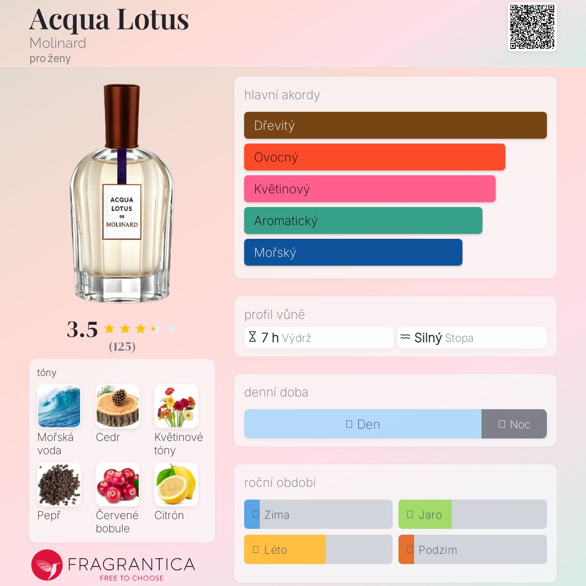 Acqua Lotus podle Molinard je Floral Aquatic vůně pro ženy. Acqua Lotus byl/a uveden/a v roce 2014. Vrchní tóny jsou Mořské tóny, Pepř, Červené bobule, Citrón a Černý rybíz; střední tóny jsouKvětiny, Jasmín a Turecká růže ; základní tóny jsou Extrakt z bílého cedru, Santalové dřevo a Pižmo.