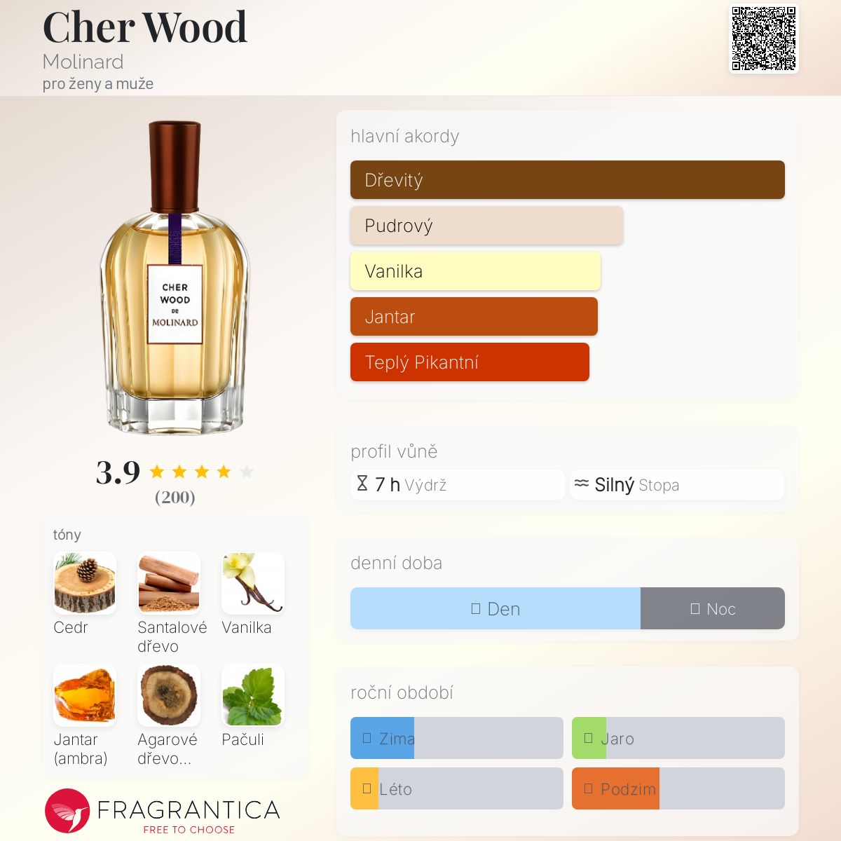 Cher Wood podle Molinard je Orientální Woody vůně pro ženy a muže. Cher Wood byl/a uveden/a v roce 2014. Vrchní tóny jsou Ovoce a Květiny; střední tóny jsouCedr, Santalové dřevo, Agarové dřevo (oud) a Pačuli ; základní tóny jsou Cedr, Madagaskarská vanilka, Jantar (ambra) a Vetiver.