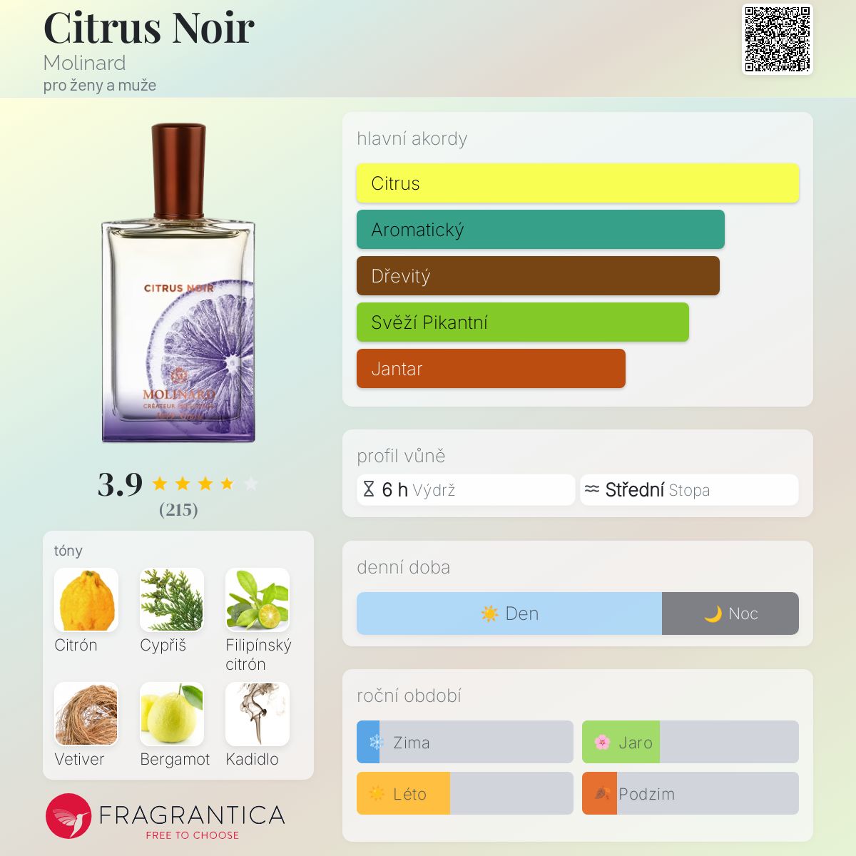 Citrus Noir podle Molinard je Citrus Aromatic vůně pro ženy a muže. Citrus Noir byl/a uveden/a v roce 2019. Vrchní tóny jsou Citrón, Filipínský citrón, Bergamot, Pepř, Elimi a Puškvorec obecný; střední tóny jsouCypřiš, Amyl Salicylate a Jasmín ; základní tóny jsou Vetiver, Kadidlo a Jantar (ambra).