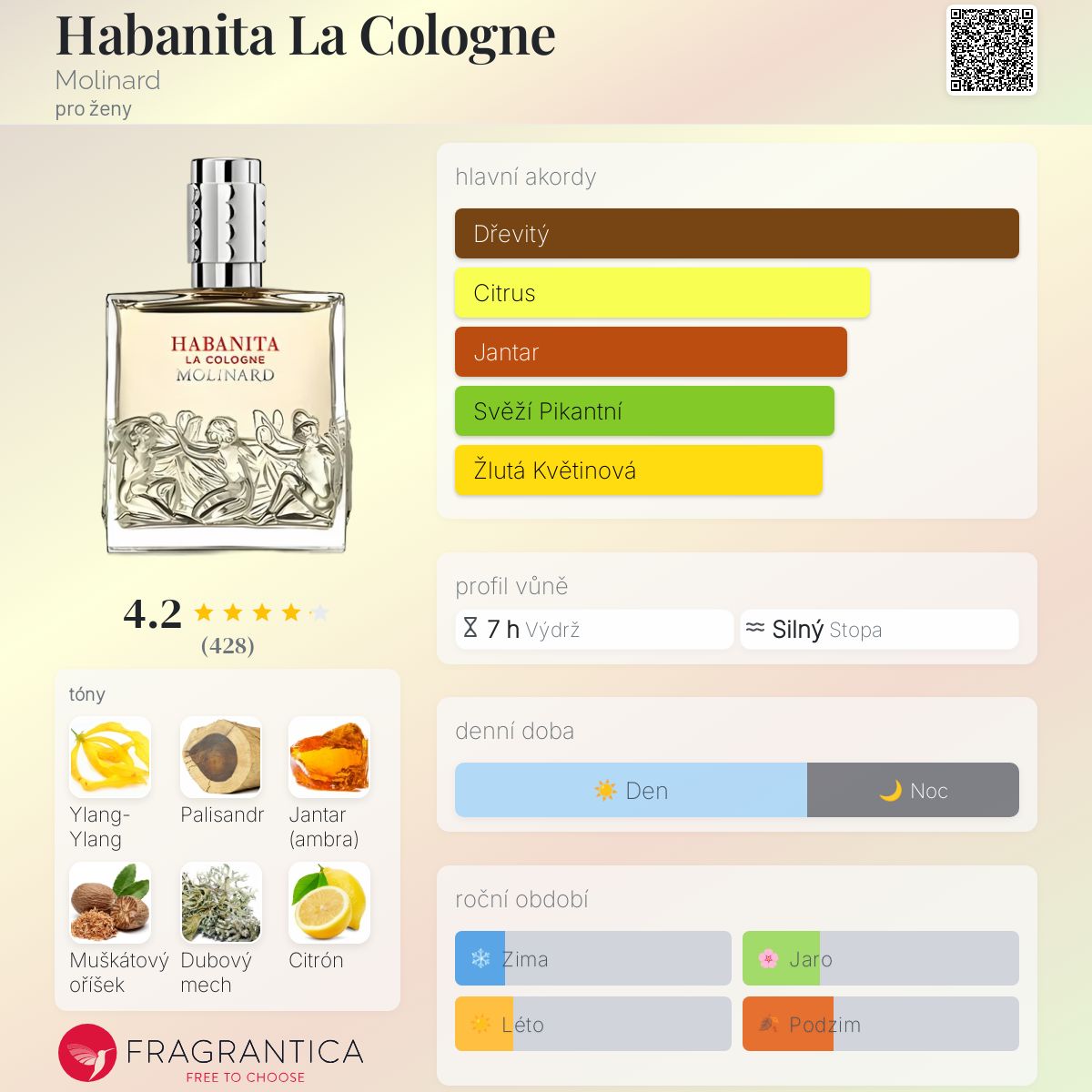Habanita La Cologne podle Molinard je Orientální vůně pro ženy. Habanita La Cologne byl/a uveden/a v roce 2016. Vrchní tóny jsou Muškátový oříšek, Citrón a Bergamot; střední tóny jsouYlang-Ylang, Palisandr, Fialka a Růže ; základní tóny jsou Jantar (ambra), Dubový mech, Vetiver a Cedr.