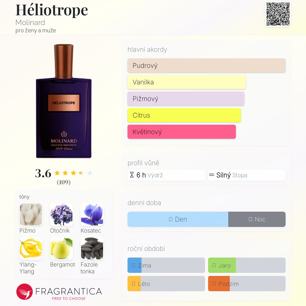Héliotrope podle Molinard je Floral vůně pro ženy a muže. Héliotrope byl/a uveden/a v roce 2015. Vrchní tóny jsou Otočník, Ylang-Ylang, Bergamot a Neroli; střední tóny jsouOtočník, Kosatec, Růže a Jasmín ; základní tóny jsou Pižmo a Fazole tonka.