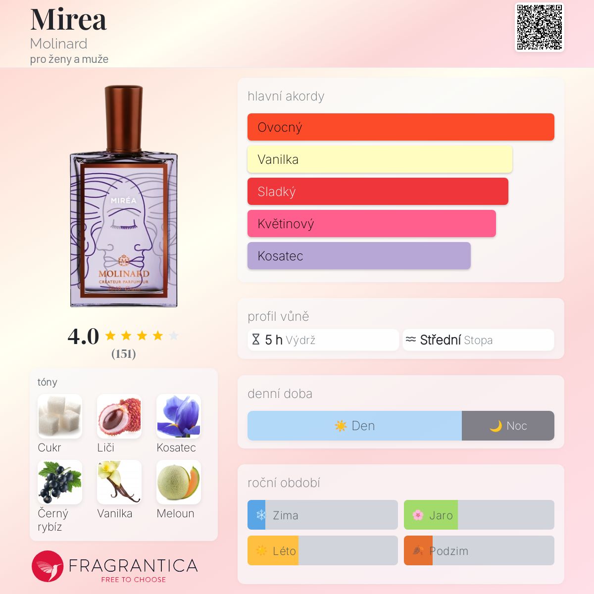 Mirea podle Molinard je Floral Fruity Gourmand vůně pro ženy a muže. Mirea byl/a uveden/a v roce 2022. Vrchní tóny jsou Liči, Černý rybíz a Meloun; střední tóny jsouFrézie, Růže a Magnólie ; základní tóny jsou Cukr, Kosatec, Vanilka a Benzoin.