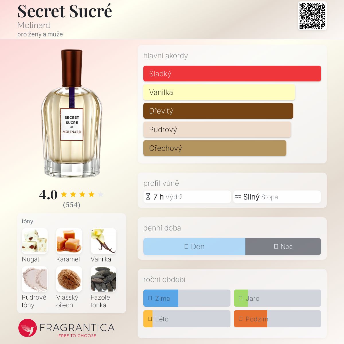 Secret Sucré podle Molinard je Orientální Vanilla vůně pro ženy a muže. Secret Sucré byl/a uveden/a v roce 2014. Vrchní tóny jsou Nugát a Pudrové tóny; střední tóny jsouKašmírové dřevo, Santalové dřevo a Jasmín ; základní tóny jsou Karamel, Vanilka, Vlašský ořech, Fazole tonka, Benzoin a Jantar (ambra).
