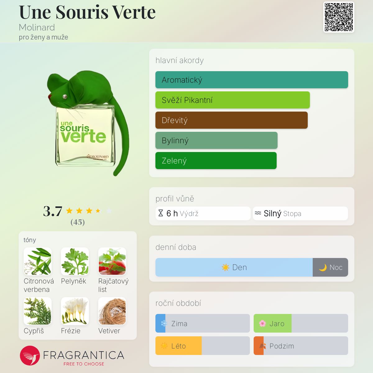 Une Souris Verte podle Molinard je Aromatic Green vůně pro ženy a muže. Une Souris Verte byl/a uveden/a v roce 2002. Vrchní tóny jsou Citronová verbena, Pelyněk, Rajčatový list, Bazalka, Rozmarýn a Cedr; střední tóny jsouCypřiš, Frézie, Pomerančový květ a Konvalinka ; základní tóny jsou Vetiver, Brazilské růžové dřevo a Med.
