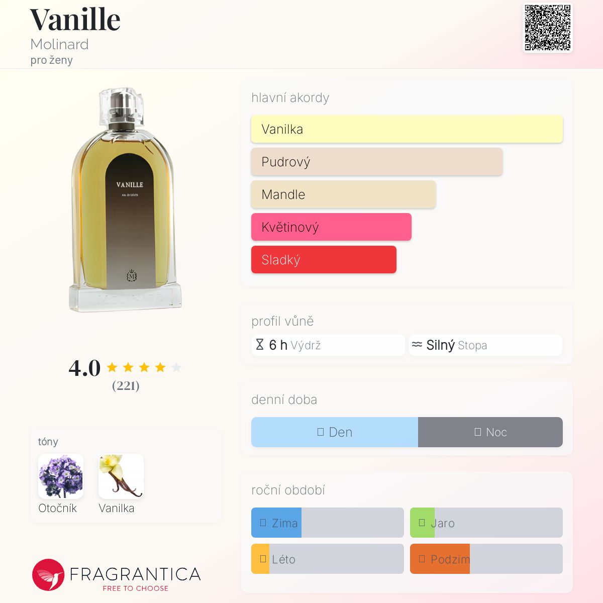 Vanille podle Molinard je Orientální Vanilla vůně pro ženy. Vanille byl/a uveden/a v roce 1993. Vrchní tón je Vanilka ; střední tón jeVanilka ; základní tóny jsou Otočník a Vanilka.
